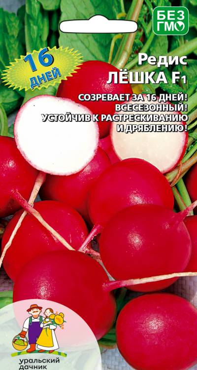 Один из самых ультраскороспелых гибридов (созревание на 16 день после появления всходов). Благодаря устойчивости к повышенной освещенности «Лёшку» можно выращивать на протяжении всего сезона. Корнеплоды устойчивы к растрескиванию и дряблению, ярко-красные, с сочной, хрустящей белоснежной мякотью и отличным вкусом.